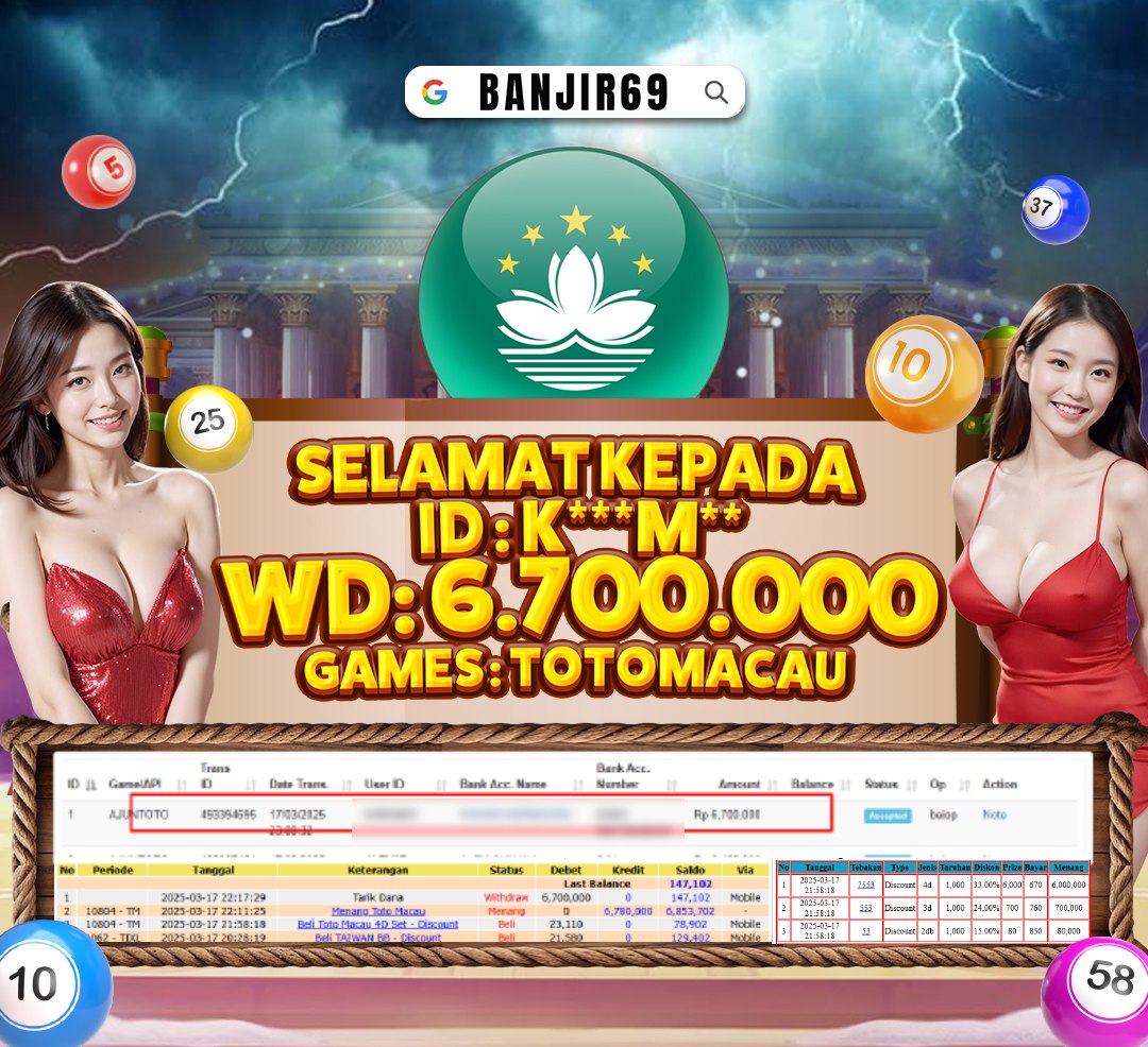 Selamat kepada user ID : CA***99 Telah berhasil melakukan penarikan sebesar Rp. 6,000,000 di Situs Banjir69